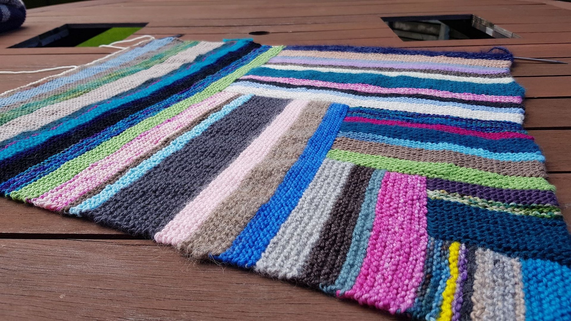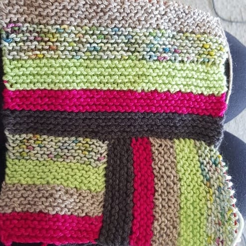 There's a lot of room for modding in this project, but there are two main versions, Organised Chaos (scrap busting) and Boardwalk (stash busting or planned design). The concept can easily translate over to crochet, in your preferred basic stitch.